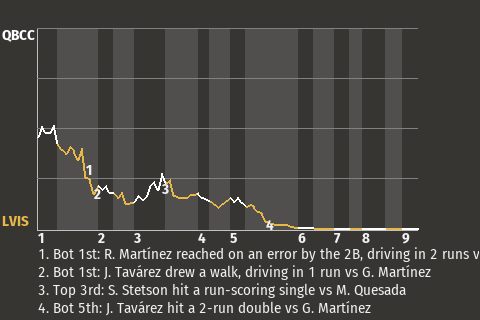 Rafael Martínez was 1 for 4 with a home run and a walk, while scoring 2 times against the Dons. In the bottom of the first inning, he reached on an error by the 2B, driving in 2 runs, putting Levis in front, 2-0.