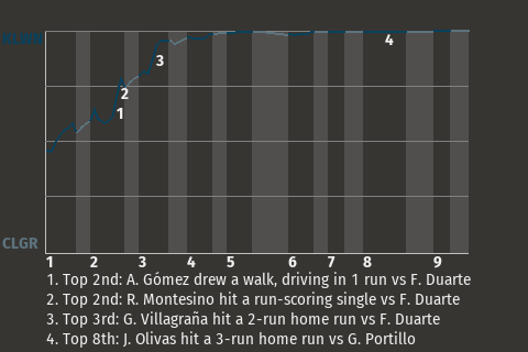 2 (2, 3rd Inning off F. Duarte, 1 on, 1 out; 9th Inning off L. Hernández, 0 on, 2 outs)