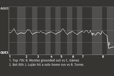 Quebradillas went up, 1-0, on José Luján's 3rd home run of the season. The solo home run, which Luján hit in the bottom of the eighth, left Aguadilla pitcher Raúl Torres muttering to himself.