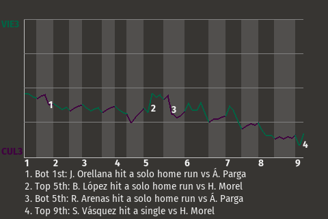The Careyes got a big at-bat from catcher Rafael Arenas, who in the bottom of the fifth hit a solo home run. It was his 1st home run of the season and put the Careyes on top, 2-1.