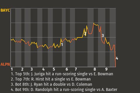 In the bottom of the ninth, with two out and the game tied, 2-2, 25-year old left fielder Dustin Randolph won it for Alpena. With runners on 1st and 3rd, Randolph hit a 1-1 fastball from Alan Baxter for a run-scoring single, giving his team the 3-2 win.