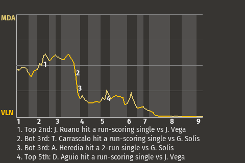 In the bottom of the third, Valencia right fielder Apolonio Heredia had a productive at-bat. With the bases loaded and two out, Heredia stroked a 2-run single to center. It made the score 3-1, Valencia. For the game, he went 2 for 4 with 2 singles, while adding 3 RBI.