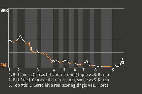 Juan Coreas hit a run-scoring triple off Sandalio Rocha in the bottom of the second, which put the Insolentes in front, 1-0. Coreas had 1 single, in addition to the triple. For the game, he went 2 for 4.