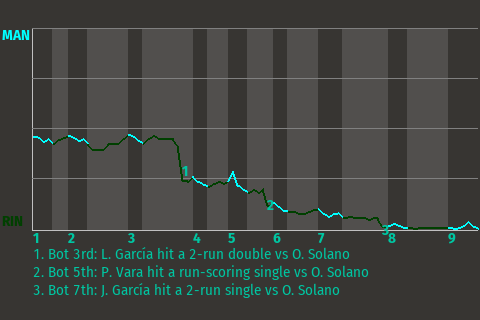 Lorenzo García hit a 2-run double off Orestes Solano in the bottom of the third, which put the Ingenieros in front, 2-0. In addition to the double, García had 1 single, while going 2 for 4.