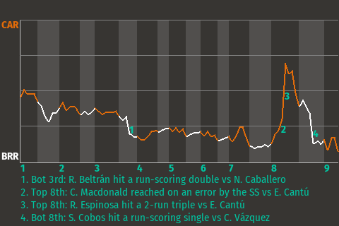 Sebastián Cobos provided some late-game heroics for Barranquitas. In the bottom of the eighth inning, he hit a run-scoring single. It came on a 0-1 sinker from Constantino Vázquez and propelled Barranquitas to a 4-3 lead.