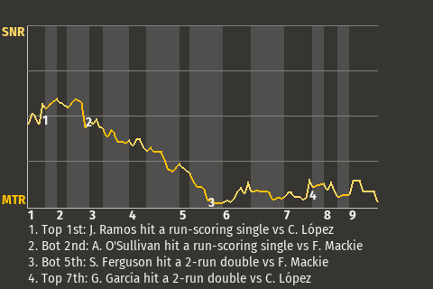 2 (6, 6th Inning off C. López, 2 on, 1 out; 7th Inning off C. López, 2 on, 2 outs)