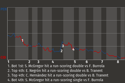 (1, 4th Inning off B. Tranent, 1 on, 2 outs)
