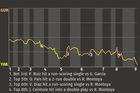 Gurabo got a decent performance from pitcher Gaspar García, but it wasn't enough to beat the Yabucoa Dulceros. Yabucoa won the Estadio de Yabucoa contest, 4-3. García threw 8.0 innings of 5-hit ball for the losing team. Melchor Alvarado earned the save, his 10th.